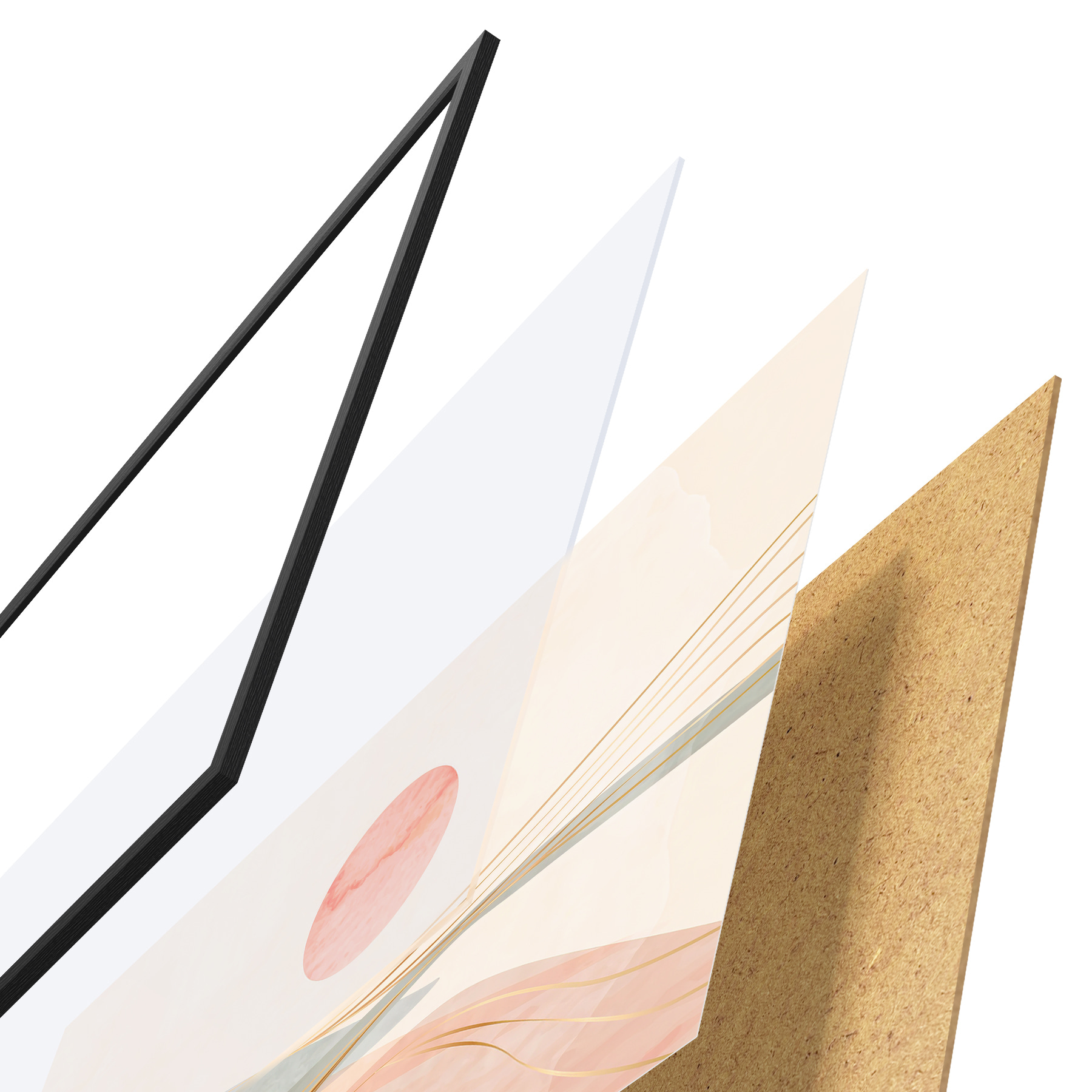 Das Poster besteht aus einem Rahmen, Plexiglas, einem gedruckten Bild und einer Rückwand aus Spanplatten. Dank der Halterungen auf der Rückseite kann das Poster sofort an die Wand gehängt werden.