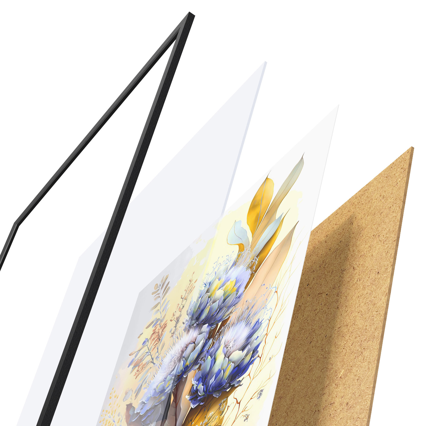Das Poster besteht aus einem Rahmen, Plexiglas, einem gedruckten Bild und einer Rückwand aus Spanplatten. Dank der Halterungen auf der Rückseite kann das Poster sofort an die Wand gehängt werden.