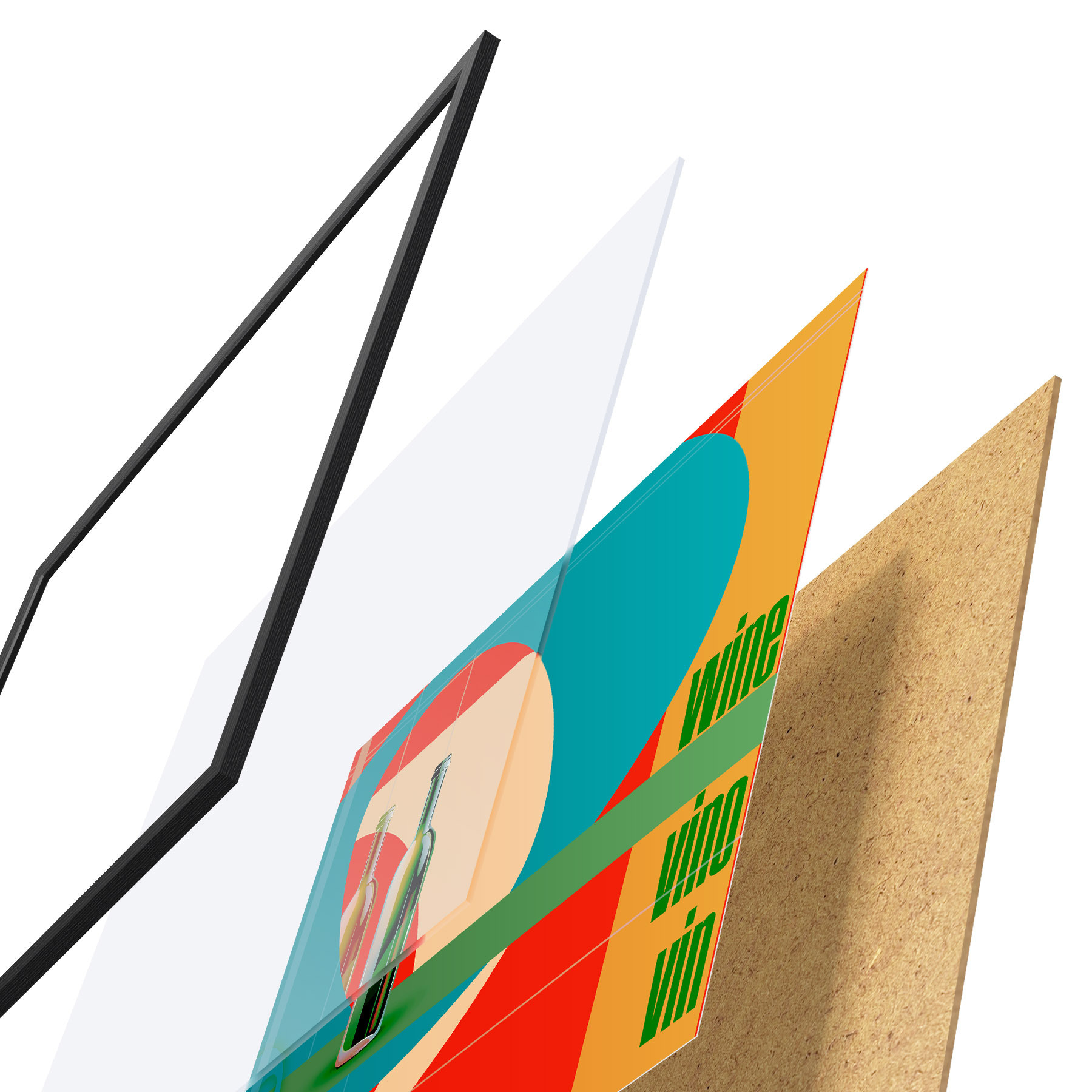 Das Poster besteht aus einem Rahmen, Plexiglas, einem gedruckten Bild und einer Rückwand aus Spanplatten. Dank der Halterungen auf der Rückseite kann das Poster sofort an die Wand gehängt werden.