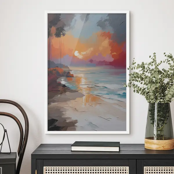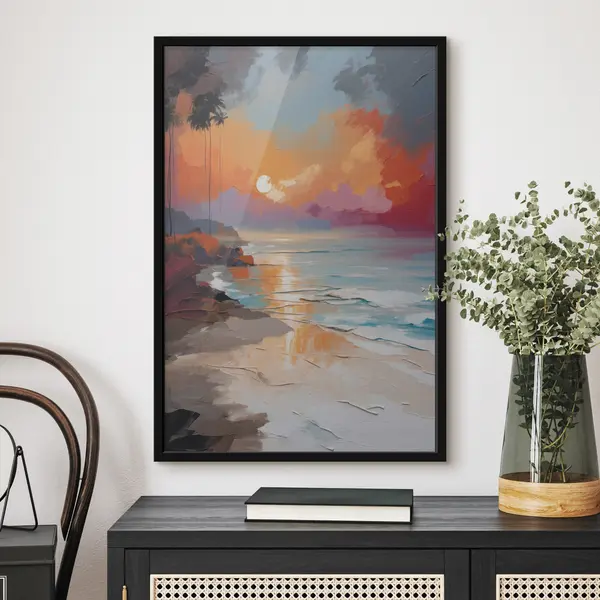 Poster Lebendiger Sonnenuntergang über einem ruhigen Strand Nr f37800