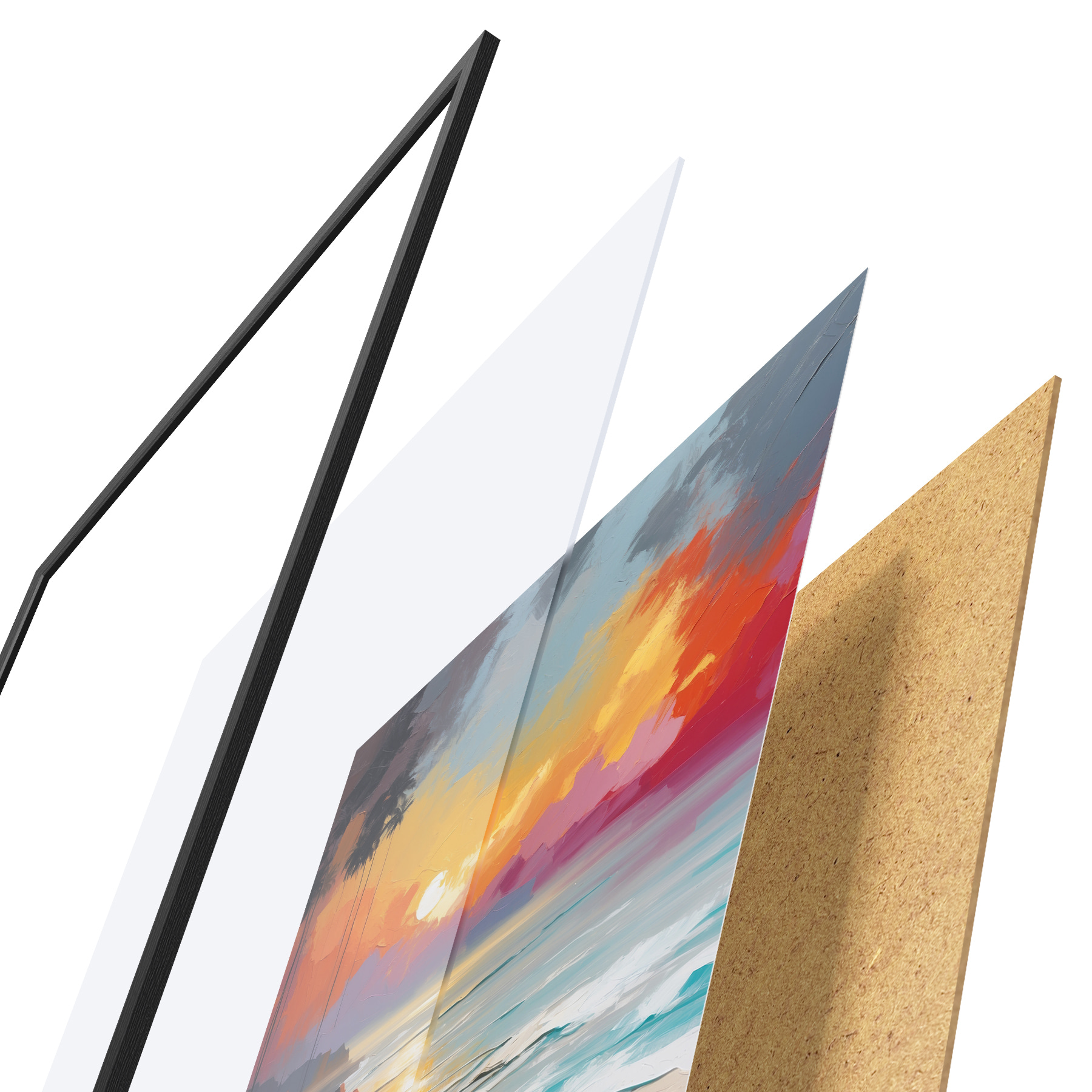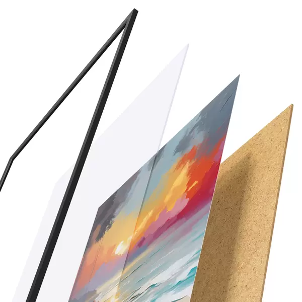 Das Poster besteht aus einem Rahmen, Plexiglas, einem gedruckten Bild und einer Rückwand aus Spanplatten. Dank der Halterungen auf der Rückseite kann das Poster sofort an die Wand gehängt werden.