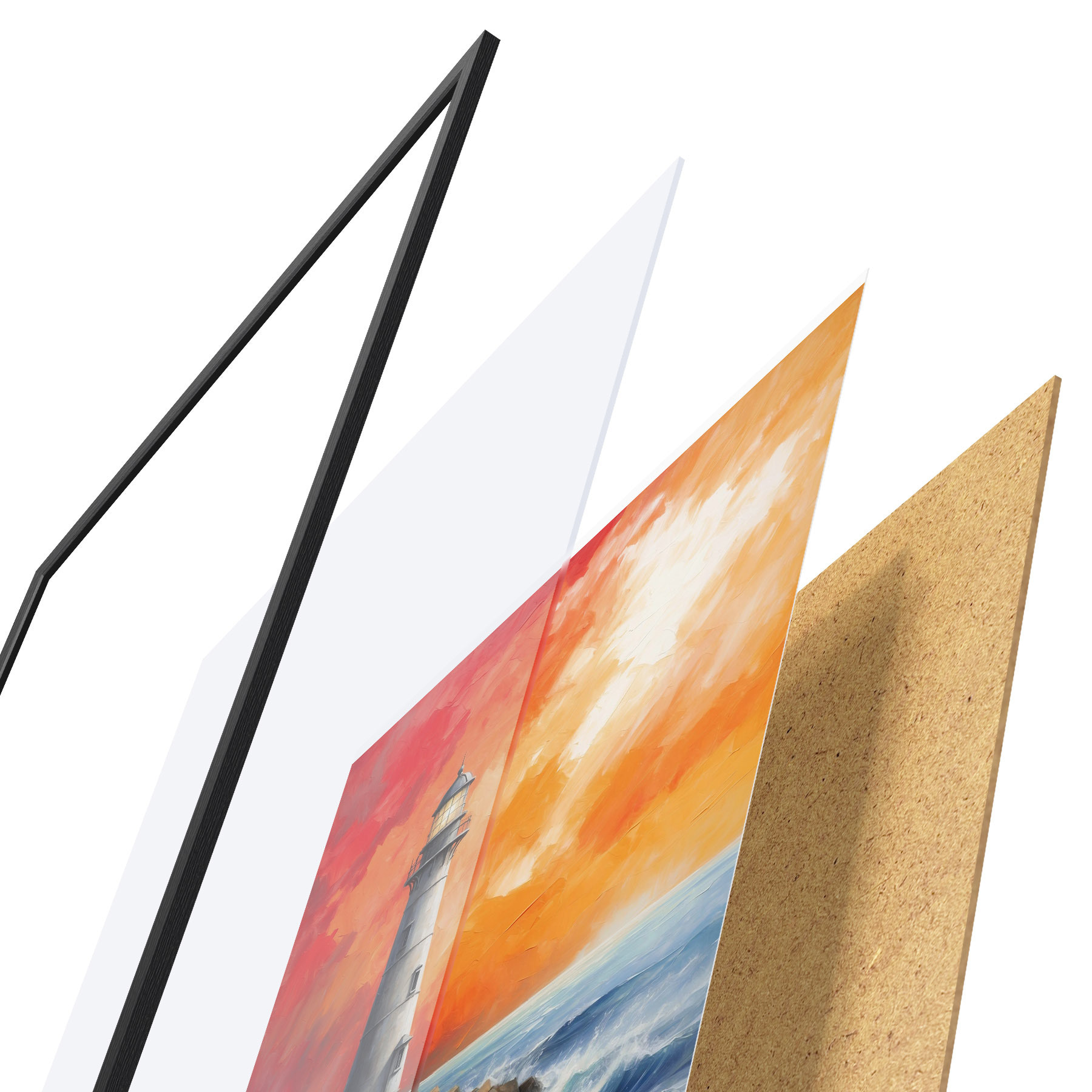 Das Poster besteht aus einem Rahmen, Plexiglas, einem gedruckten Bild und einer Rückwand aus Spanplatten. Dank der Halterungen auf der Rückseite kann das Poster sofort an die Wand gehängt werden.