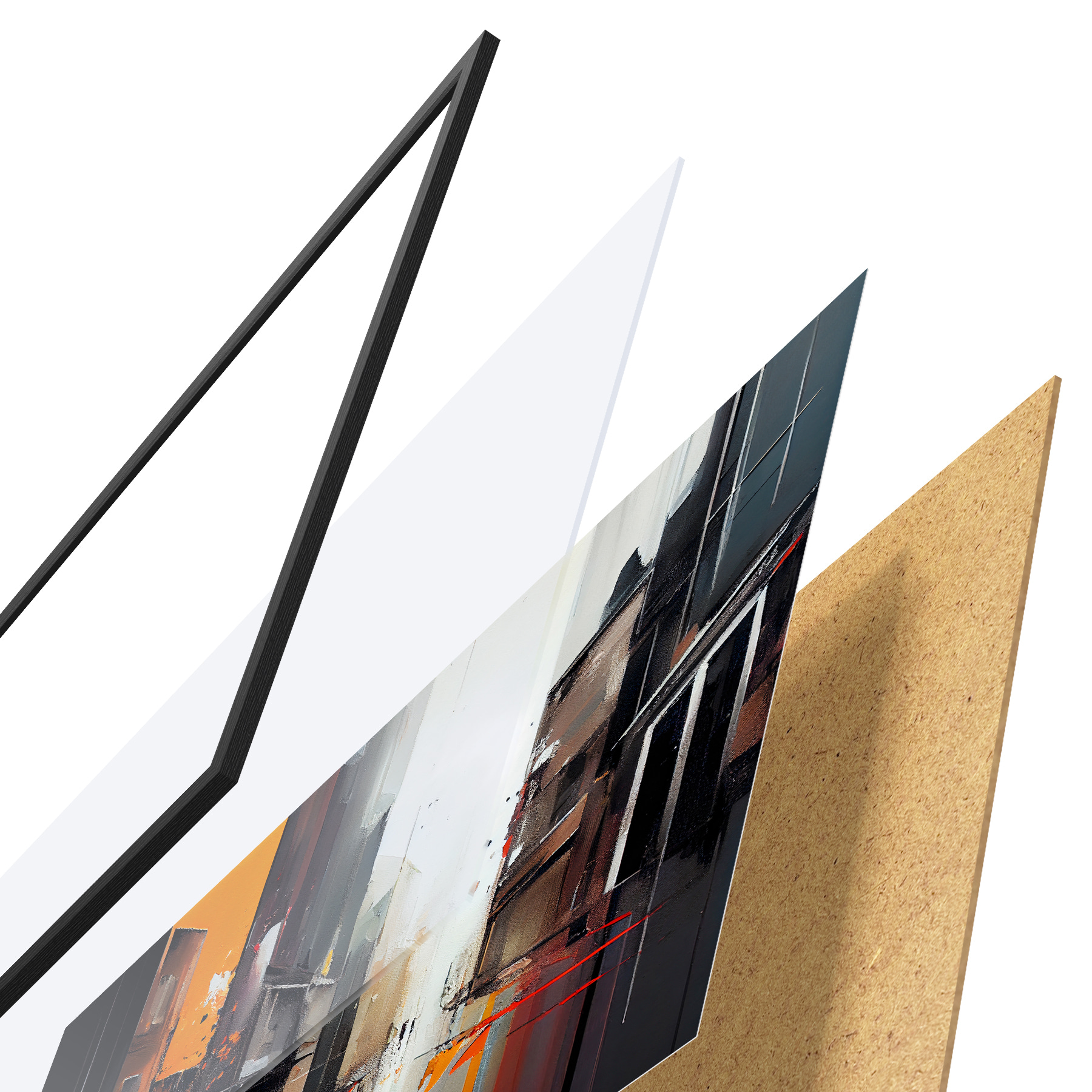 Das Poster besteht aus einem Rahmen, Plexiglas, einem gedruckten Bild und einer Rückwand aus Spanplatten. Dank der Halterungen auf der Rückseite kann das Poster sofort an die Wand gehängt werden.