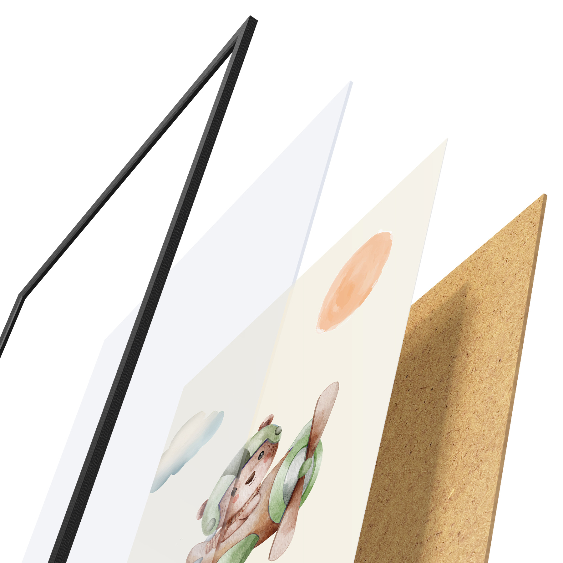 Das Poster besteht aus einem Rahmen, Plexiglas, einem gedruckten Bild und einer Rückwand aus Spanplatten. Dank der Halterungen auf der Rückseite kann das Poster sofort an die Wand gehängt werden.