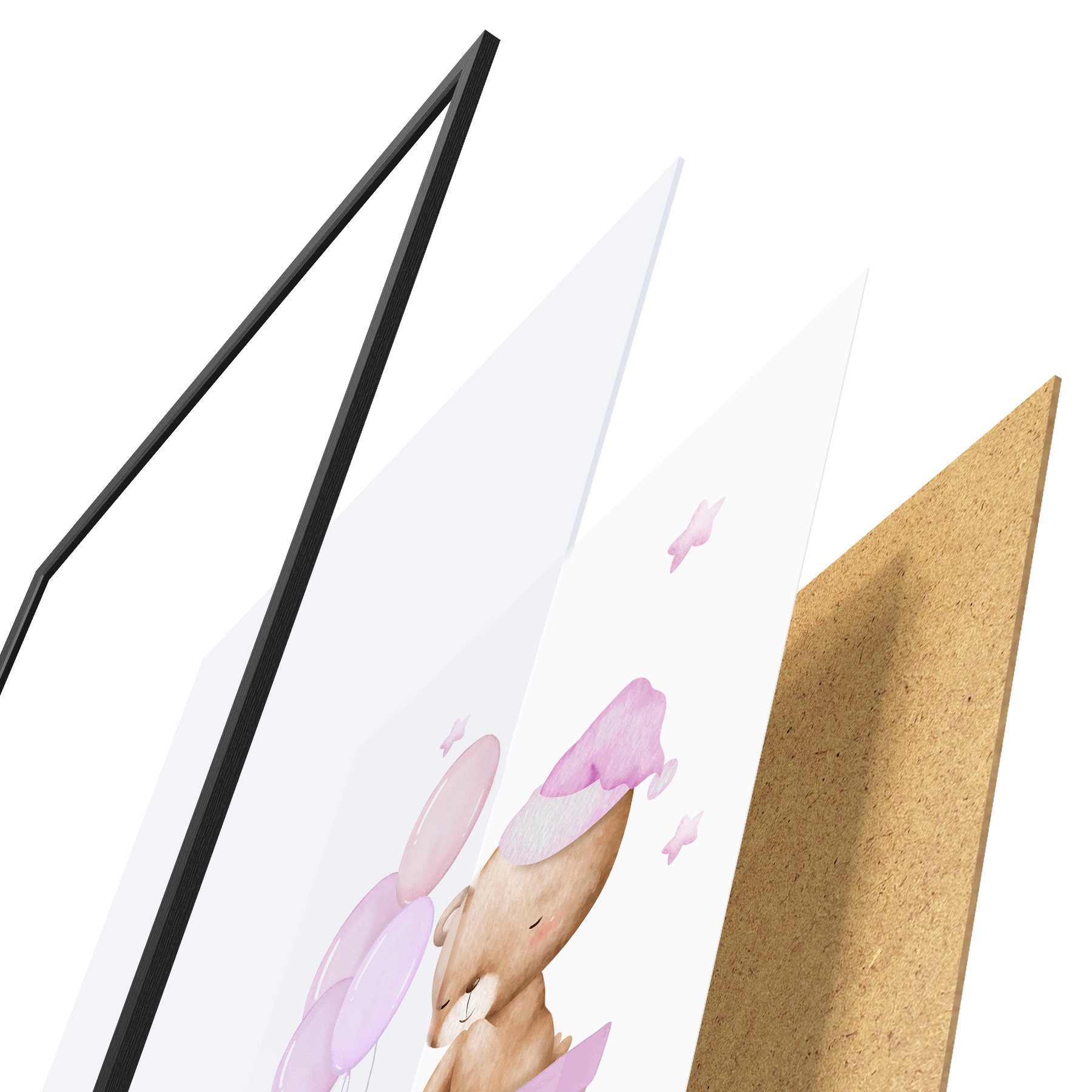 Das Poster besteht aus einem Rahmen, Plexiglas, einem gedruckten Bild und einer Rückwand aus Spanplatten. Dank der Halterungen auf der Rückseite kann das Poster sofort an die Wand gehängt werden.