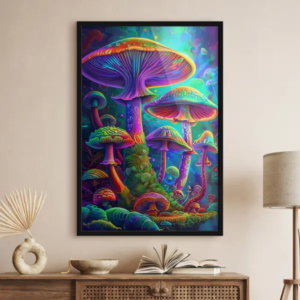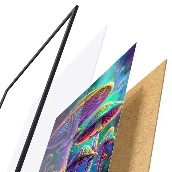Das Poster besteht aus einem Rahmen, Plexiglas, einem gedruckten Bild und einer Rückwand aus Spanplatten. Dank der Halterungen auf der Rückseite kann das Poster sofort an die Wand gehängt werden.