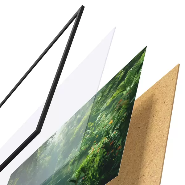 Das Poster besteht aus einem Rahmen, Plexiglas, einem gedruckten Bild und einer Rückwand aus Spanplatten. Dank der Halterungen auf der Rückseite kann das Poster sofort an die Wand gehängt werden.