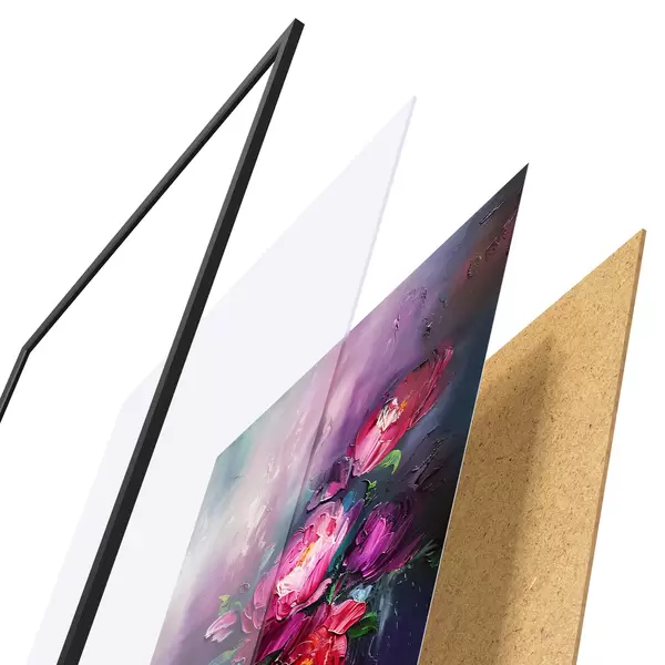 Das Poster besteht aus einem Rahmen, Plexiglas, einem gedruckten Bild und einer Rückwand aus Spanplatten. Dank der Halterungen auf der Rückseite kann das Poster sofort an die Wand gehängt werden.
