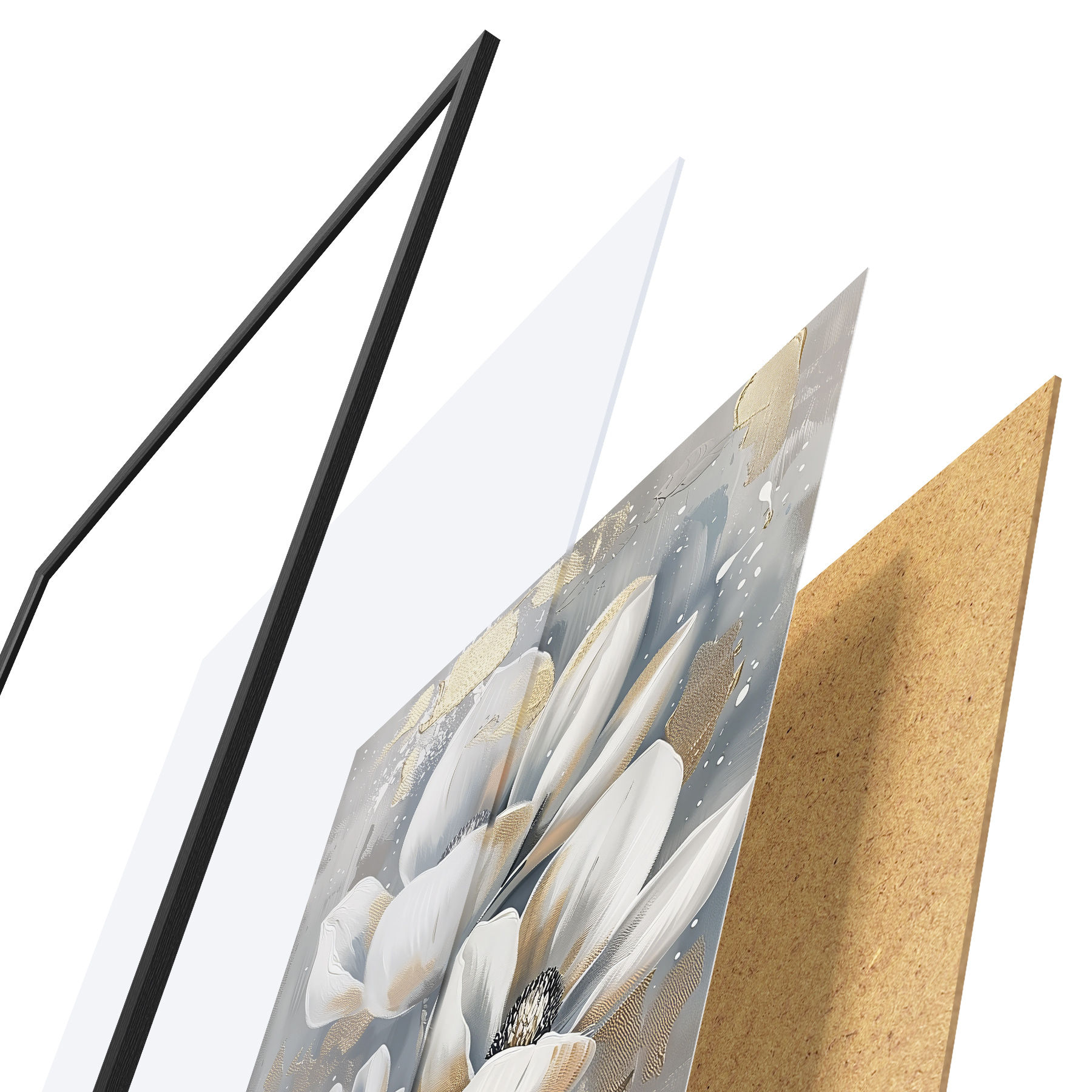 Das Poster besteht aus einem Rahmen, Plexiglas, einem gedruckten Bild und einer Rückwand aus Spanplatten. Dank der Halterungen auf der Rückseite kann das Poster sofort an die Wand gehängt werden.