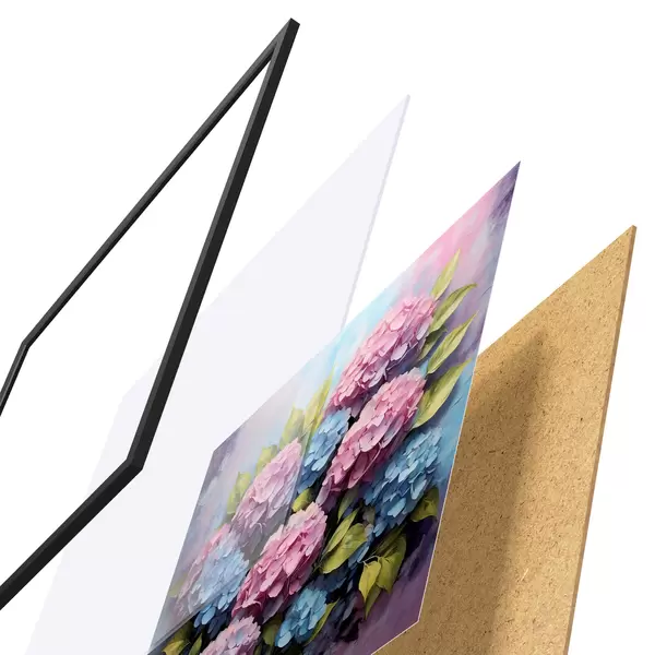Das Poster besteht aus einem Rahmen, Plexiglas, einem gedruckten Bild und einer Rückwand aus Spanplatten. Dank der Halterungen auf der Rückseite kann das Poster sofort an die Wand gehängt werden.