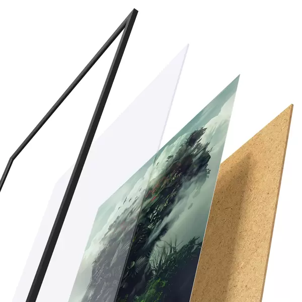 Das Poster besteht aus einem Rahmen, Plexiglas, einem gedruckten Bild und einer Rückwand aus Spanplatten. Dank der Halterungen auf der Rückseite kann das Poster sofort an die Wand gehängt werden.