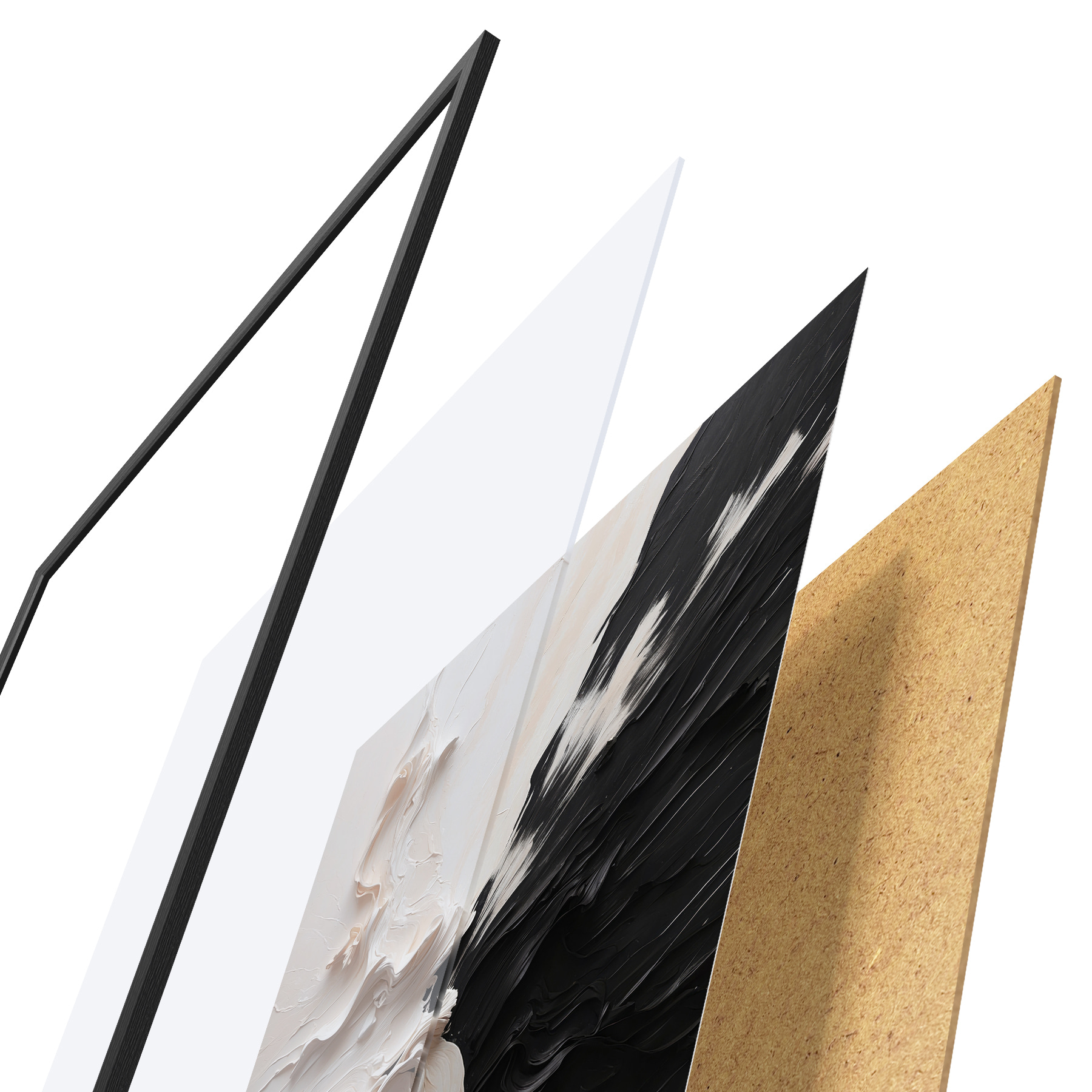 Das Poster besteht aus einem Rahmen, Plexiglas, einem gedruckten Bild und einer Rückwand aus Spanplatten. Dank der Halterungen auf der Rückseite kann das Poster sofort an die Wand gehängt werden.
