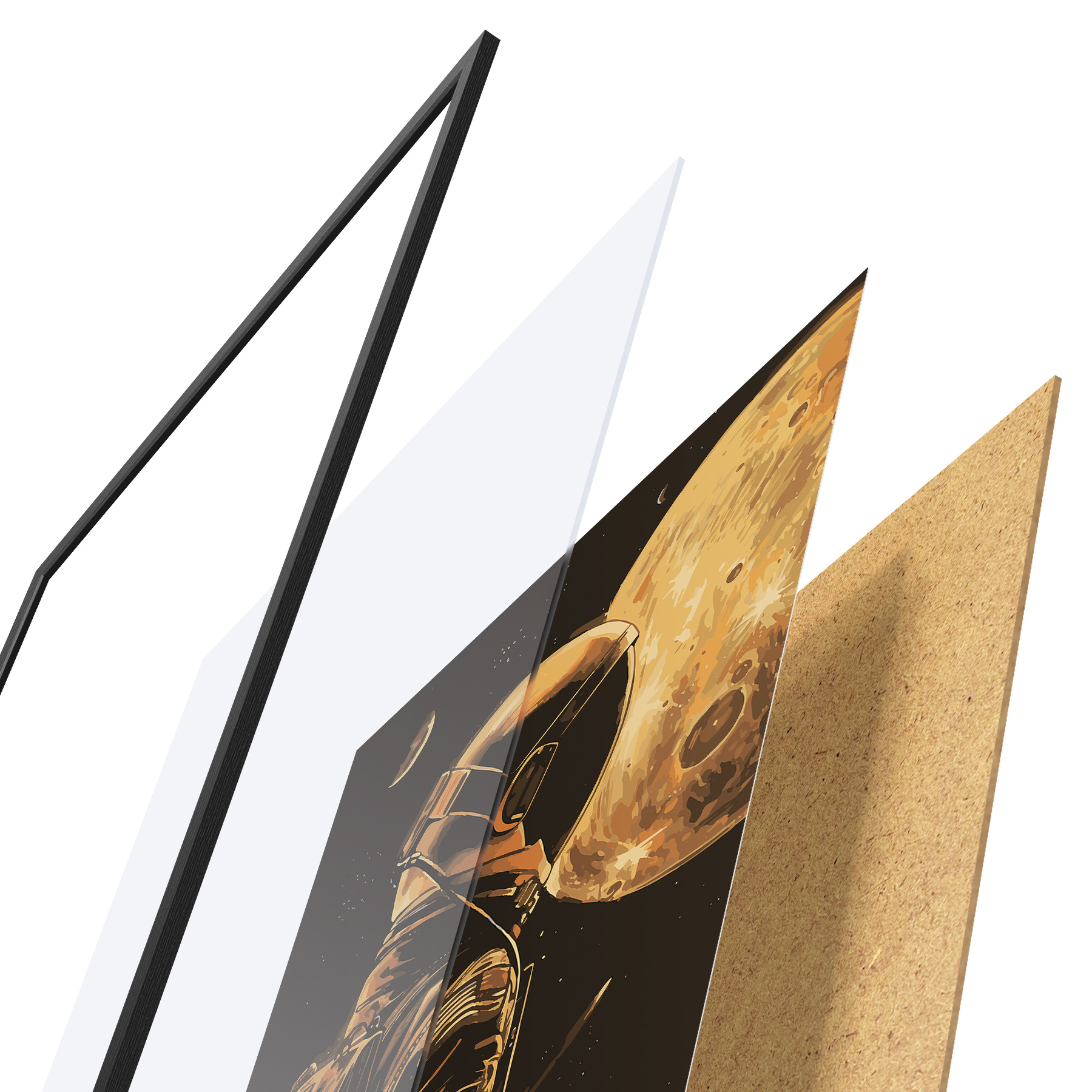 Das Poster besteht aus einem Rahmen, Plexiglas, einem gedruckten Bild und einer Rückwand aus Spanplatten. Dank der Halterungen auf der Rückseite kann das Poster sofort an die Wand gehängt werden.