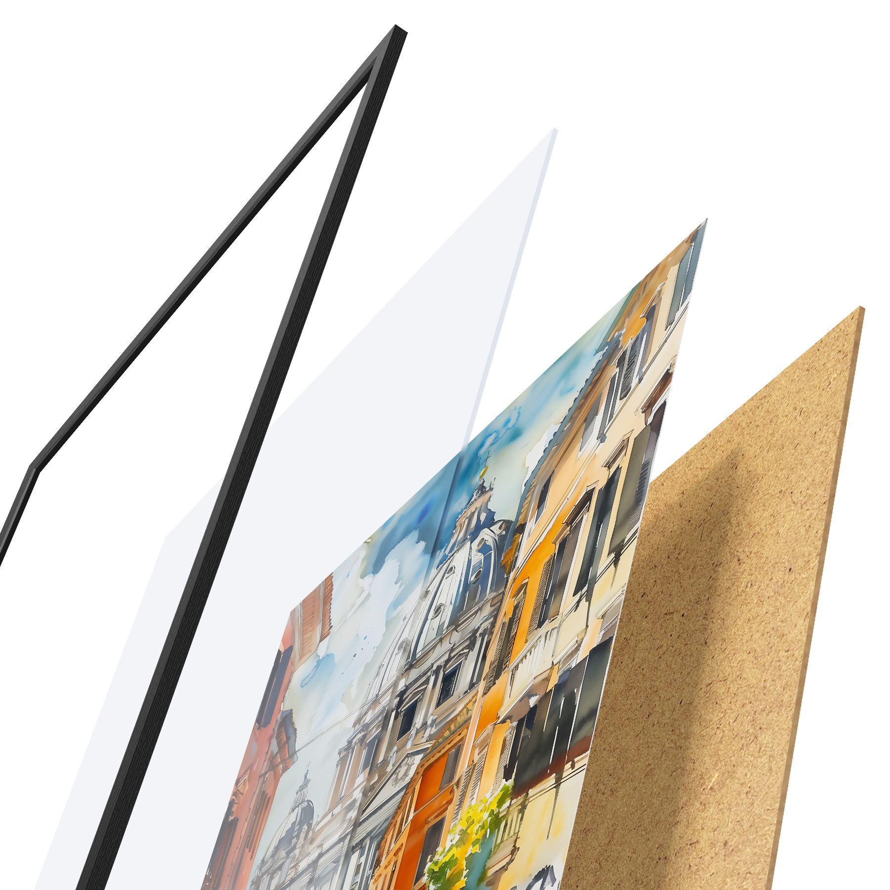 Das Poster besteht aus einem Rahmen, Plexiglas, einem gedruckten Bild und einer Rückwand aus Spanplatten. Dank der Halterungen auf der Rückseite kann das Poster sofort an die Wand gehängt werden.