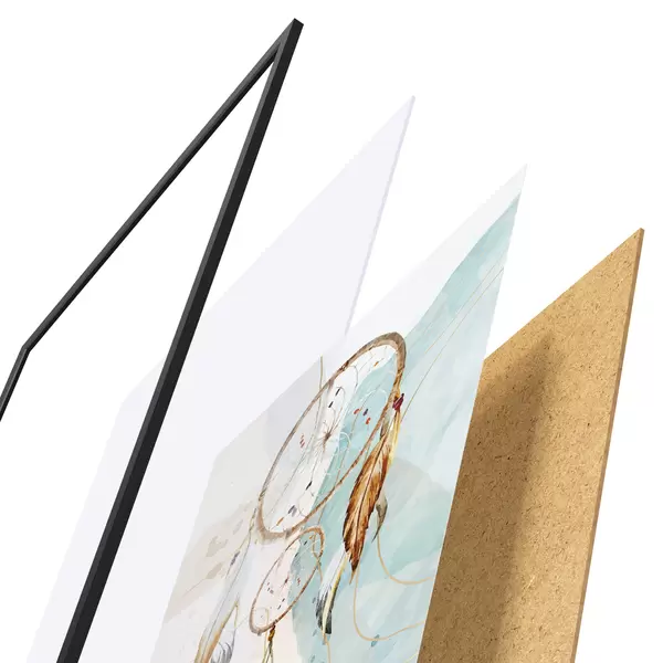 Das Poster besteht aus einem Rahmen, Plexiglas, einem gedruckten Bild und einer Rückwand aus Spanplatten. Dank der Halterungen auf der Rückseite kann das Poster sofort an die Wand gehängt werden.