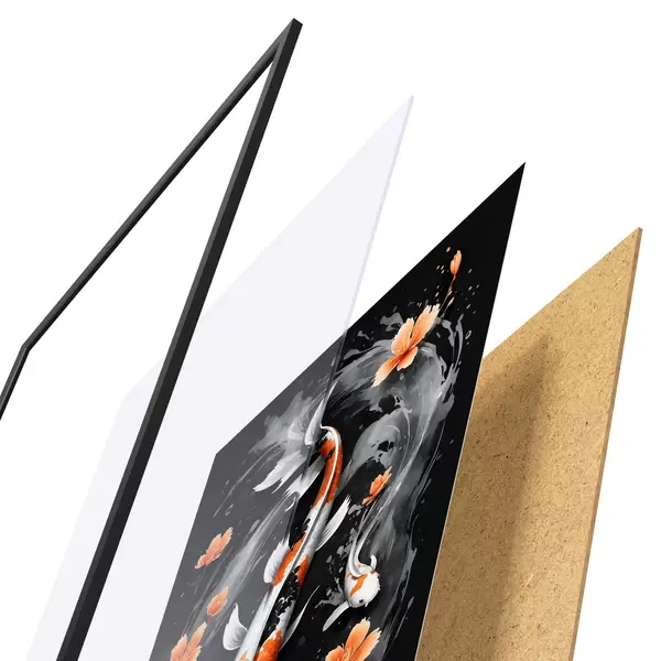 Das Poster besteht aus einem Rahmen, Plexiglas, einem gedruckten Bild und einer Rückwand aus Spanplatten. Dank der Halterungen auf der Rückseite kann das Poster sofort an die Wand gehängt werden.