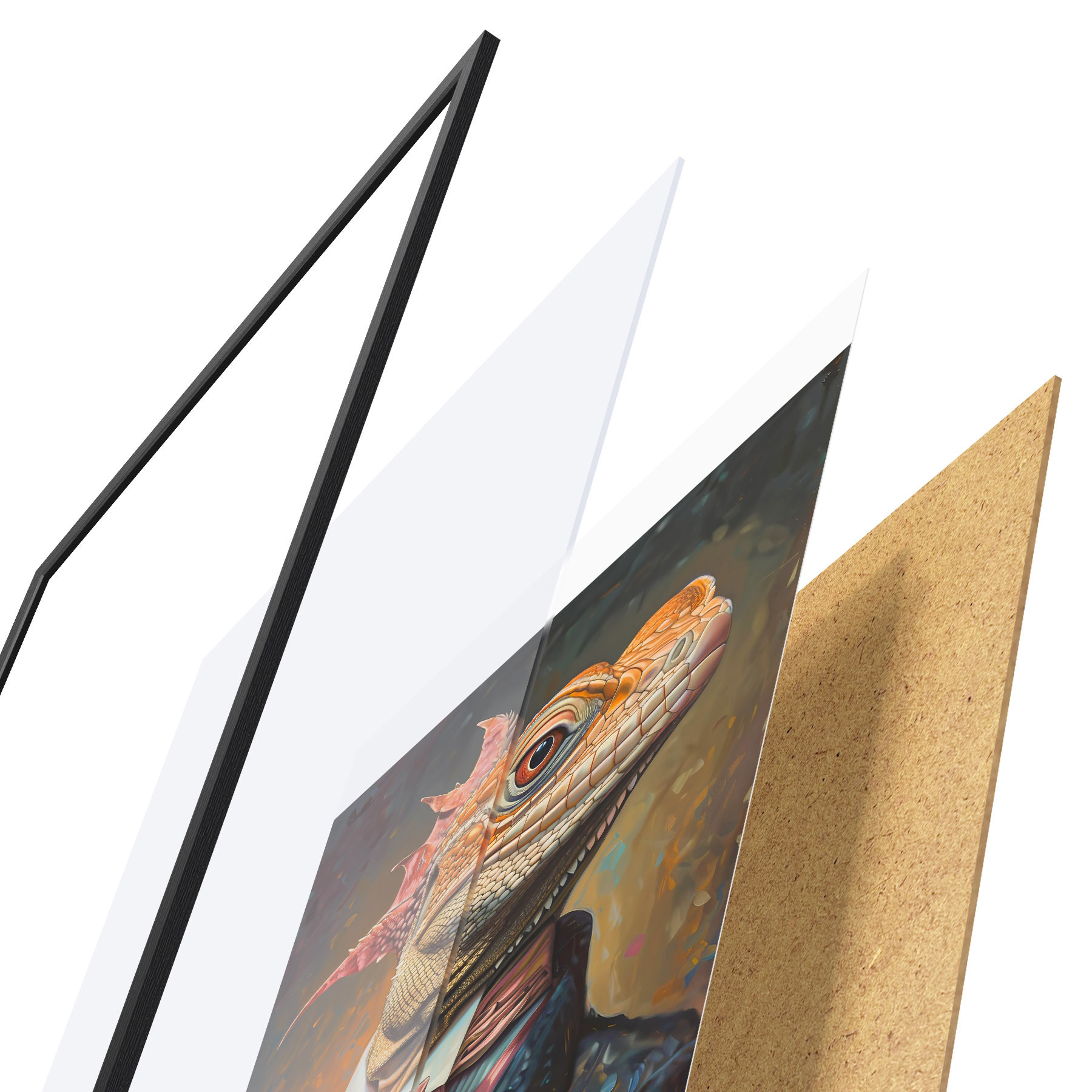 Das Poster besteht aus einem Rahmen, Plexiglas, einem gedruckten Bild und einer Rückwand aus Spanplatten. Dank der Halterungen auf der Rückseite kann das Poster sofort an die Wand gehängt werden.