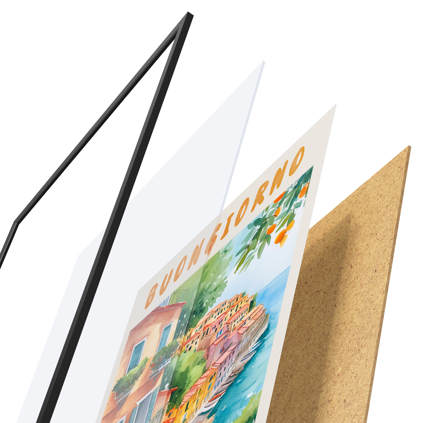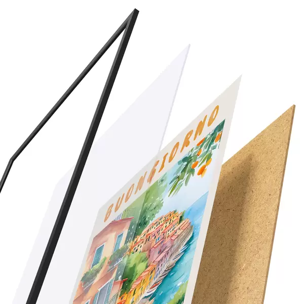 Das Poster besteht aus einem Rahmen, Plexiglas, einem gedruckten Bild und einer Rückwand aus Spanplatten. Dank der Halterungen auf der Rückseite kann das Poster sofort an die Wand gehängt werden.
