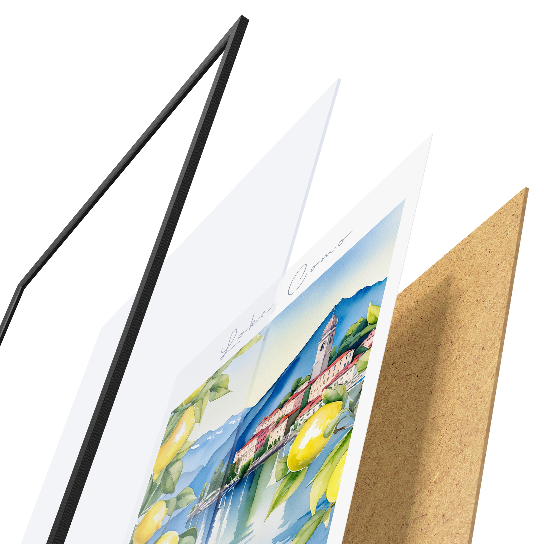 Das Poster besteht aus einem Rahmen, Plexiglas, einem gedruckten Bild und einer Rückwand aus Spanplatten. Dank der Halterungen auf der Rückseite kann das Poster sofort an die Wand gehängt werden.