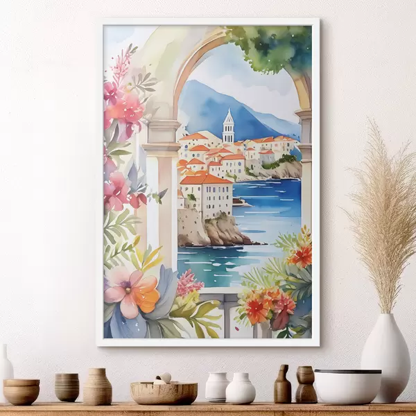 Poster Mediterrane Architektur, Aquarell, Sommerblumen, blaues Meer, Berge Nr f38408