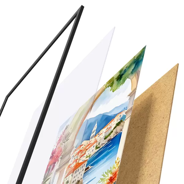 Das Poster besteht aus einem Rahmen, Plexiglas, einem gedruckten Bild und einer Rückwand aus Spanplatten. Dank der Halterungen auf der Rückseite kann das Poster sofort an die Wand gehängt werden.