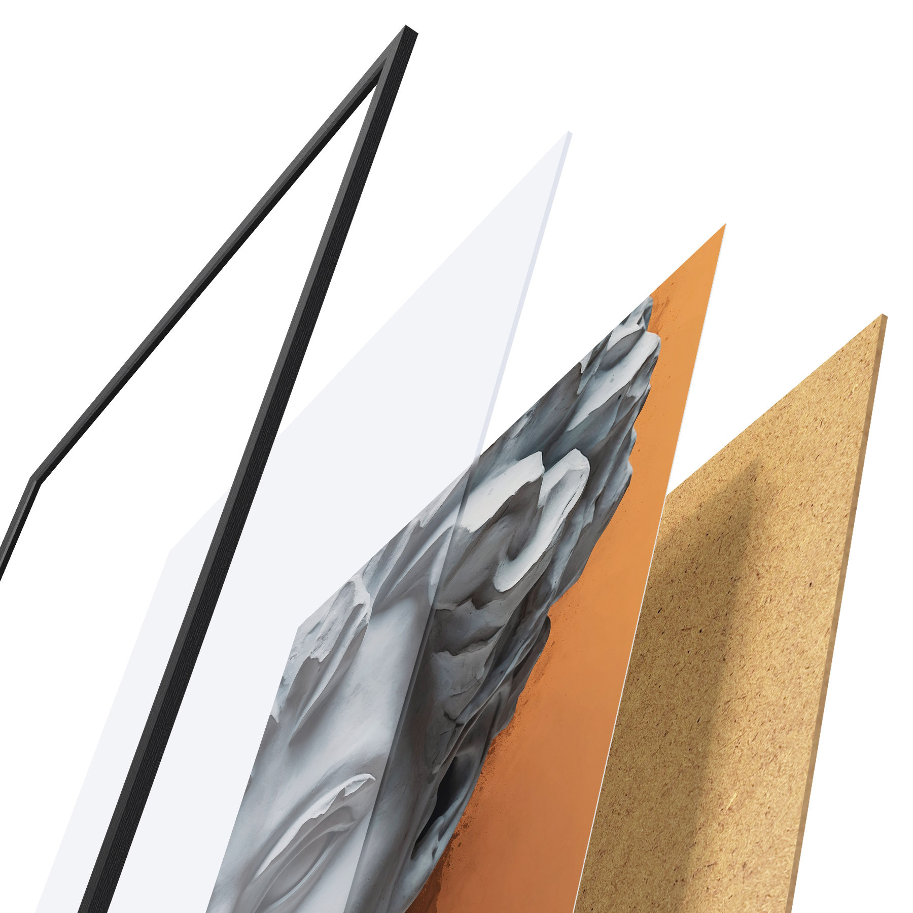 Das Poster besteht aus einem Rahmen, Plexiglas, einem gedruckten Bild und einer Rückwand aus Spanplatten. Dank der Halterungen auf der Rückseite kann das Poster sofort an die Wand gehängt werden.