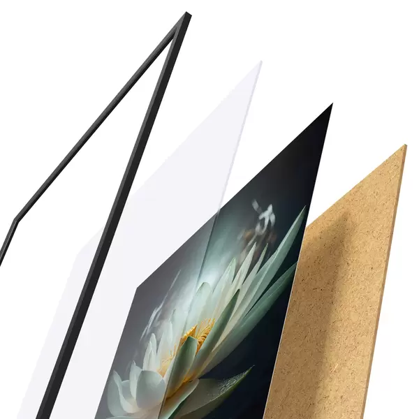 Das Poster besteht aus einem Rahmen, Plexiglas, einem gedruckten Bild und einer Rückwand aus Spanplatten. Dank der Halterungen auf der Rückseite kann das Poster sofort an die Wand gehängt werden.