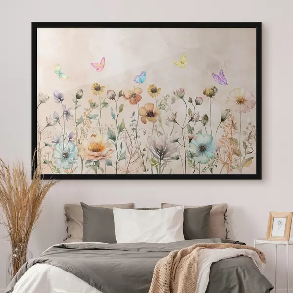 Poster Wildblumen mit Aquarellfarben, leuchtende Schmetterlinge, Pastell f38441