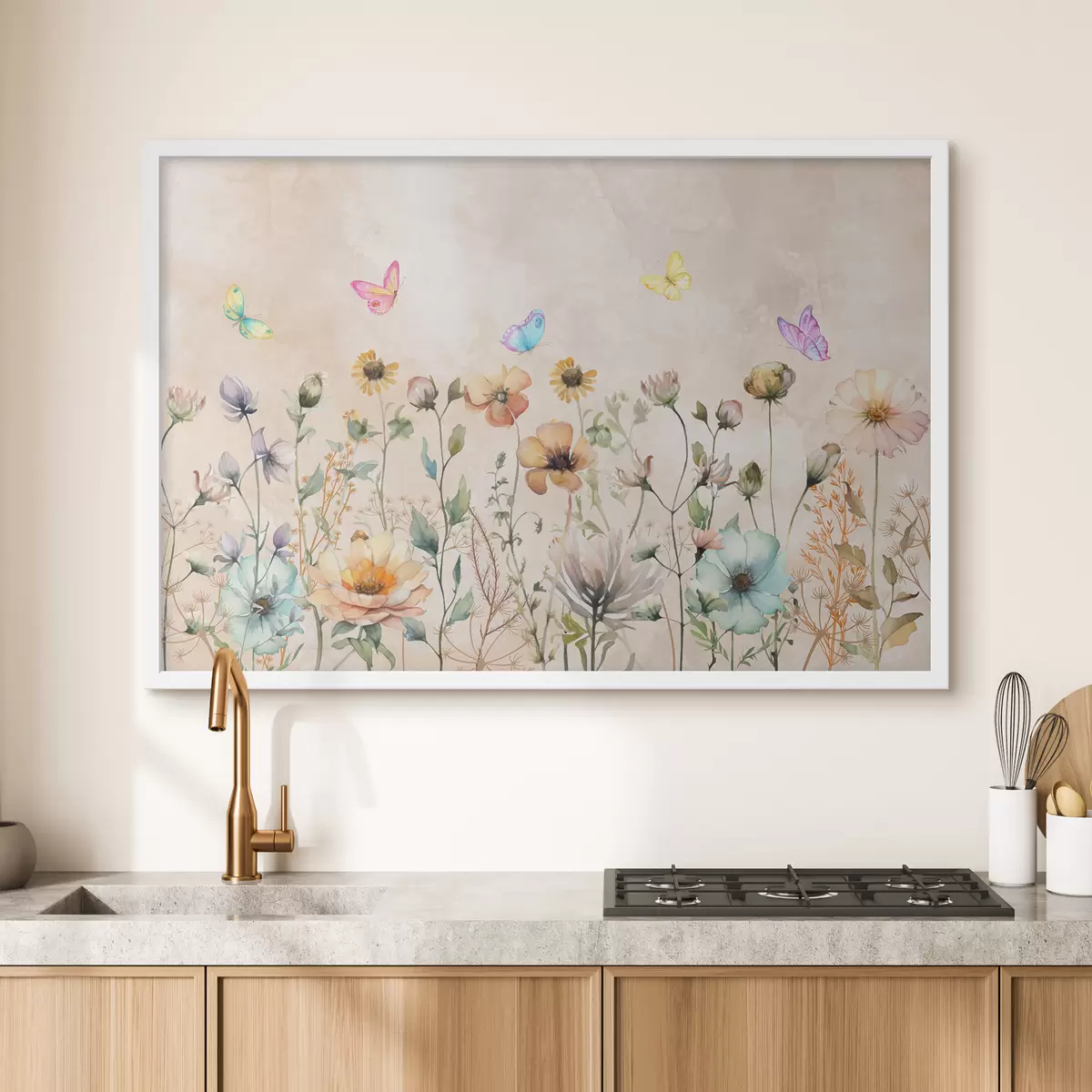 Poster Wildblumen mit Aquarellfarben, leuchtende Schmetterlinge, Pastell Nr f38441