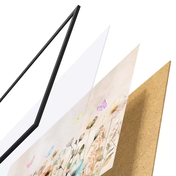 Das Poster besteht aus einem Rahmen, Plexiglas, einem gedruckten Bild und einer Rückwand aus Spanplatten. Dank der Halterungen auf der Rückseite kann das Poster sofort an die Wand gehängt werden.