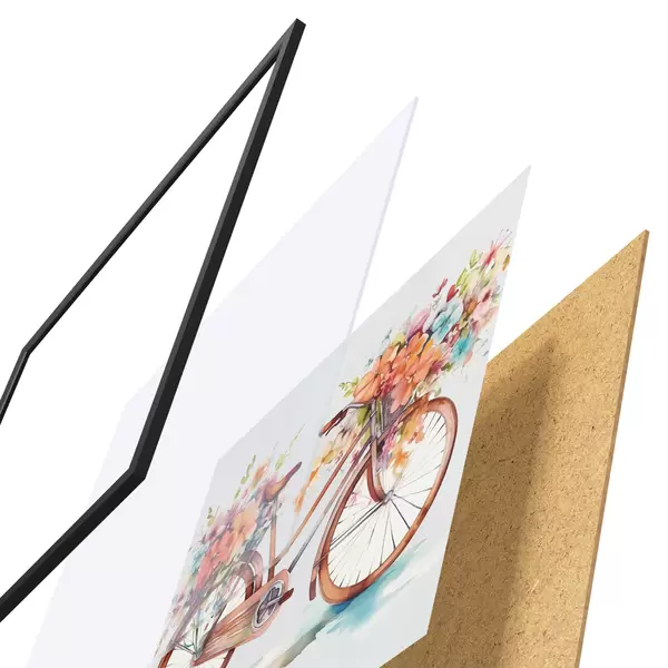 Das Poster besteht aus einem Rahmen, Plexiglas, einem gedruckten Bild und einer Rückwand aus Spanplatten. Dank der Halterungen auf der Rückseite kann das Poster sofort an die Wand gehängt werden.