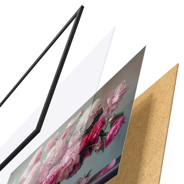 Das Poster besteht aus einem Rahmen, Plexiglas, einem gedruckten Bild und einer Rückwand aus Spanplatten. Dank der Halterungen auf der Rückseite kann das Poster sofort an die Wand gehängt werden.