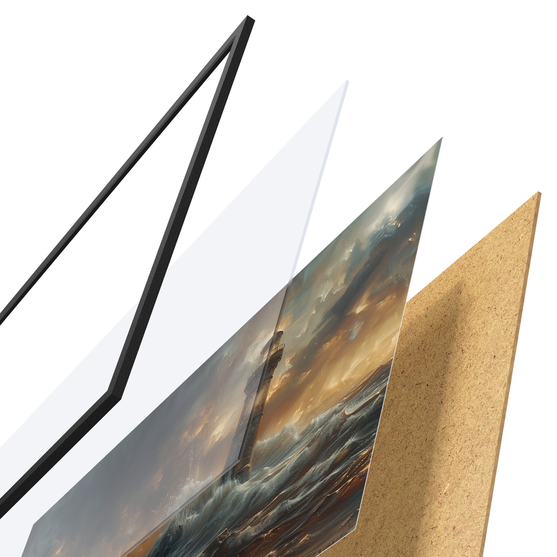 Das Poster besteht aus einem Rahmen, Plexiglas, einem gedruckten Bild und einer Rückwand aus Spanplatten. Dank der Halterungen auf der Rückseite kann das Poster sofort an die Wand gehängt werden.