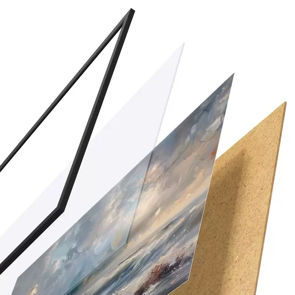 Das Poster besteht aus einem Rahmen, Plexiglas, einem gedruckten Bild und einer Rückwand aus Spanplatten. Dank der Halterungen auf der Rückseite kann das Poster sofort an die Wand gehängt werden.