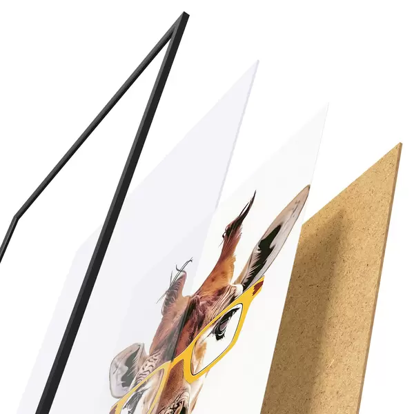 Das Poster besteht aus einem Rahmen, Plexiglas, einem gedruckten Bild und einer Rückwand aus Spanplatten. Dank der Halterungen auf der Rückseite kann das Poster sofort an die Wand gehängt werden.