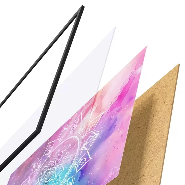 Das Poster besteht aus einem Rahmen, Plexiglas, einem gedruckten Bild und einer Rückwand aus Spanplatten. Dank der Halterungen auf der Rückseite kann das Poster sofort an die Wand gehängt werden.
