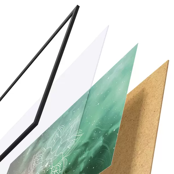 Das Poster besteht aus einem Rahmen, Plexiglas, einem gedruckten Bild und einer Rückwand aus Spanplatten. Dank der Halterungen auf der Rückseite kann das Poster sofort an die Wand gehängt werden.