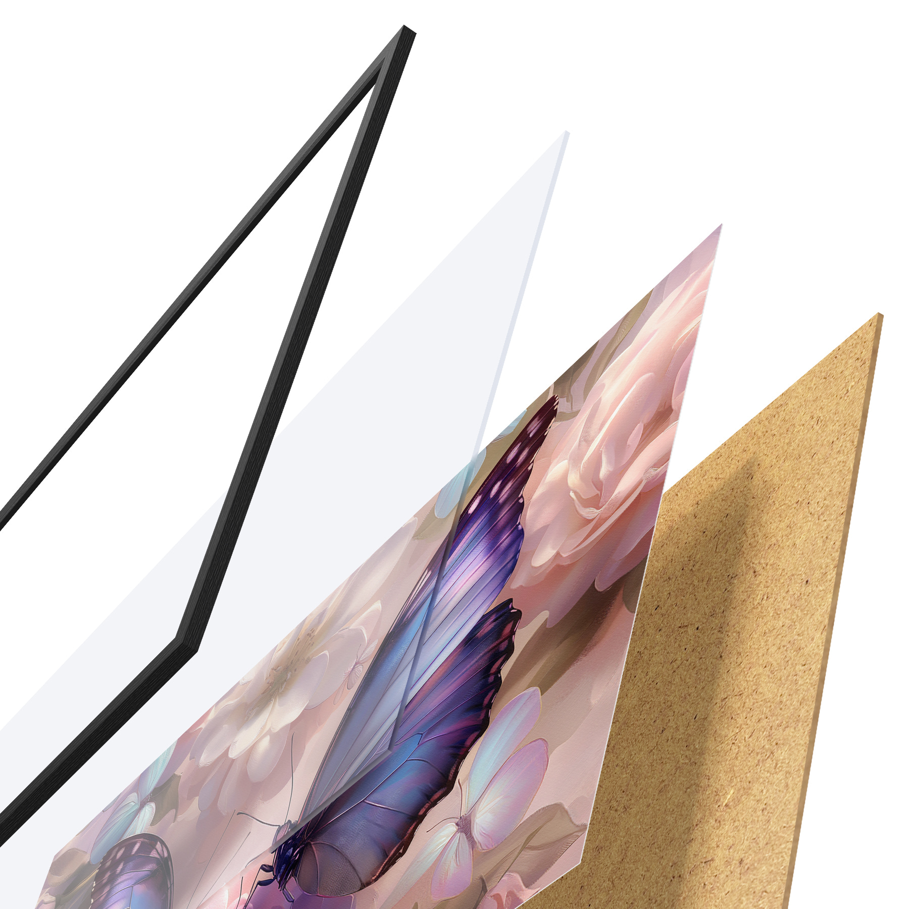 Das Poster besteht aus einem Rahmen, Plexiglas, einem gedruckten Bild und einer Rückwand aus Spanplatten. Dank der Halterungen auf der Rückseite kann das Poster sofort an die Wand gehängt werden.