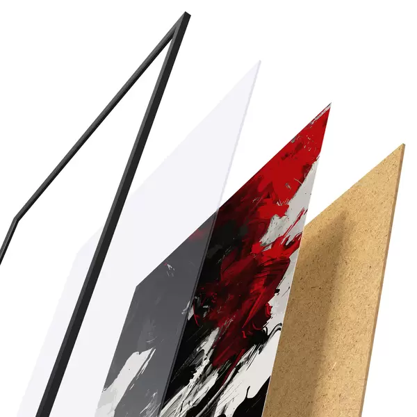 Das Poster besteht aus einem Rahmen, Plexiglas, einem gedruckten Bild und einer Rückwand aus Spanplatten. Dank der Halterungen auf der Rückseite kann das Poster sofort an die Wand gehängt werden.