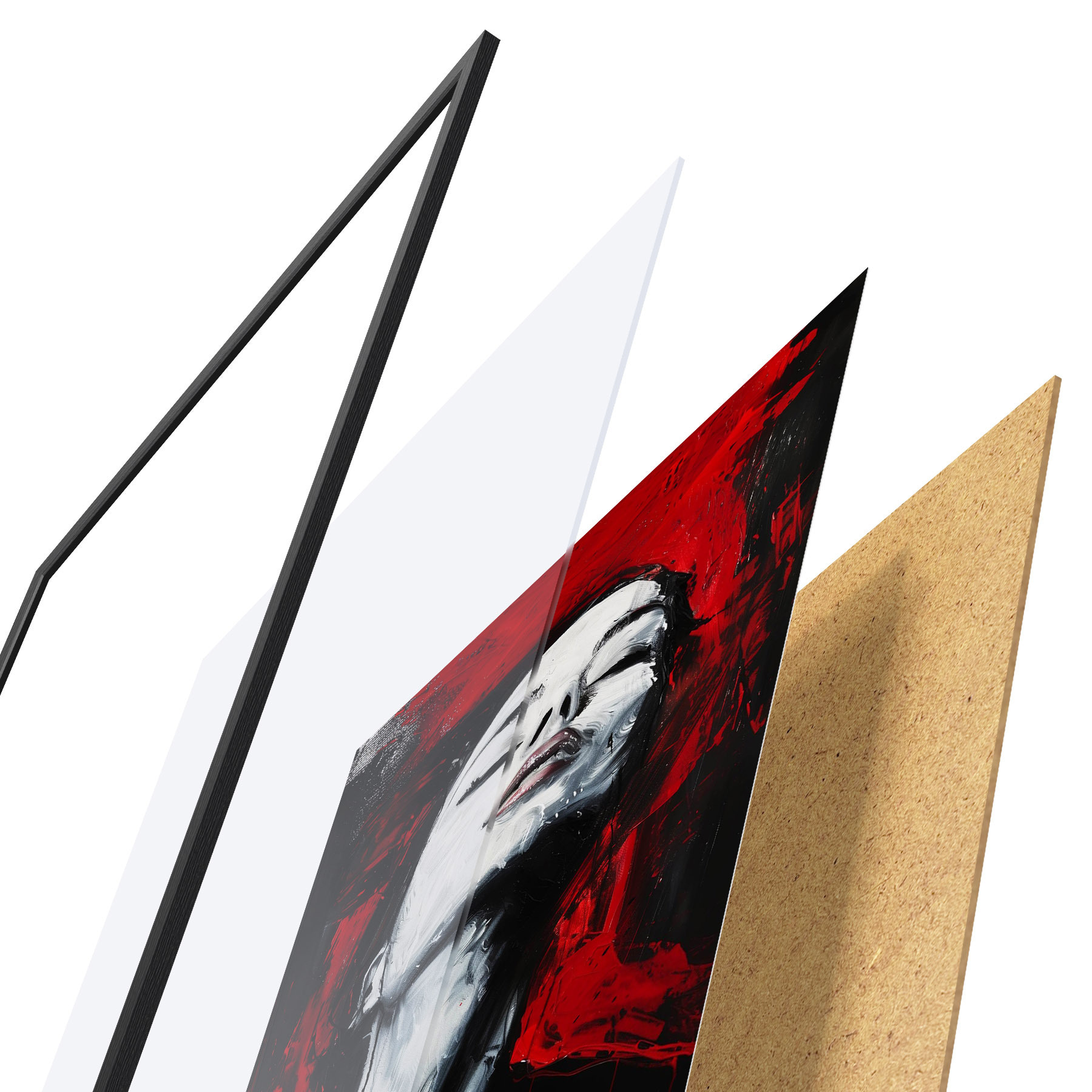 Das Poster besteht aus einem Rahmen, Plexiglas, einem gedruckten Bild und einer Rückwand aus Spanplatten. Dank der Halterungen auf der Rückseite kann das Poster sofort an die Wand gehängt werden.