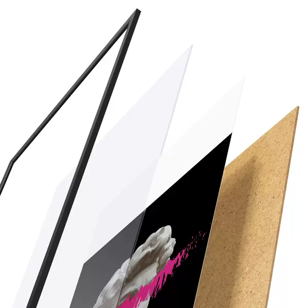 Das Poster besteht aus einem Rahmen, Plexiglas, einem gedruckten Bild und einer Rückwand aus Spanplatten. Dank der Halterungen auf der Rückseite kann das Poster sofort an die Wand gehängt werden.