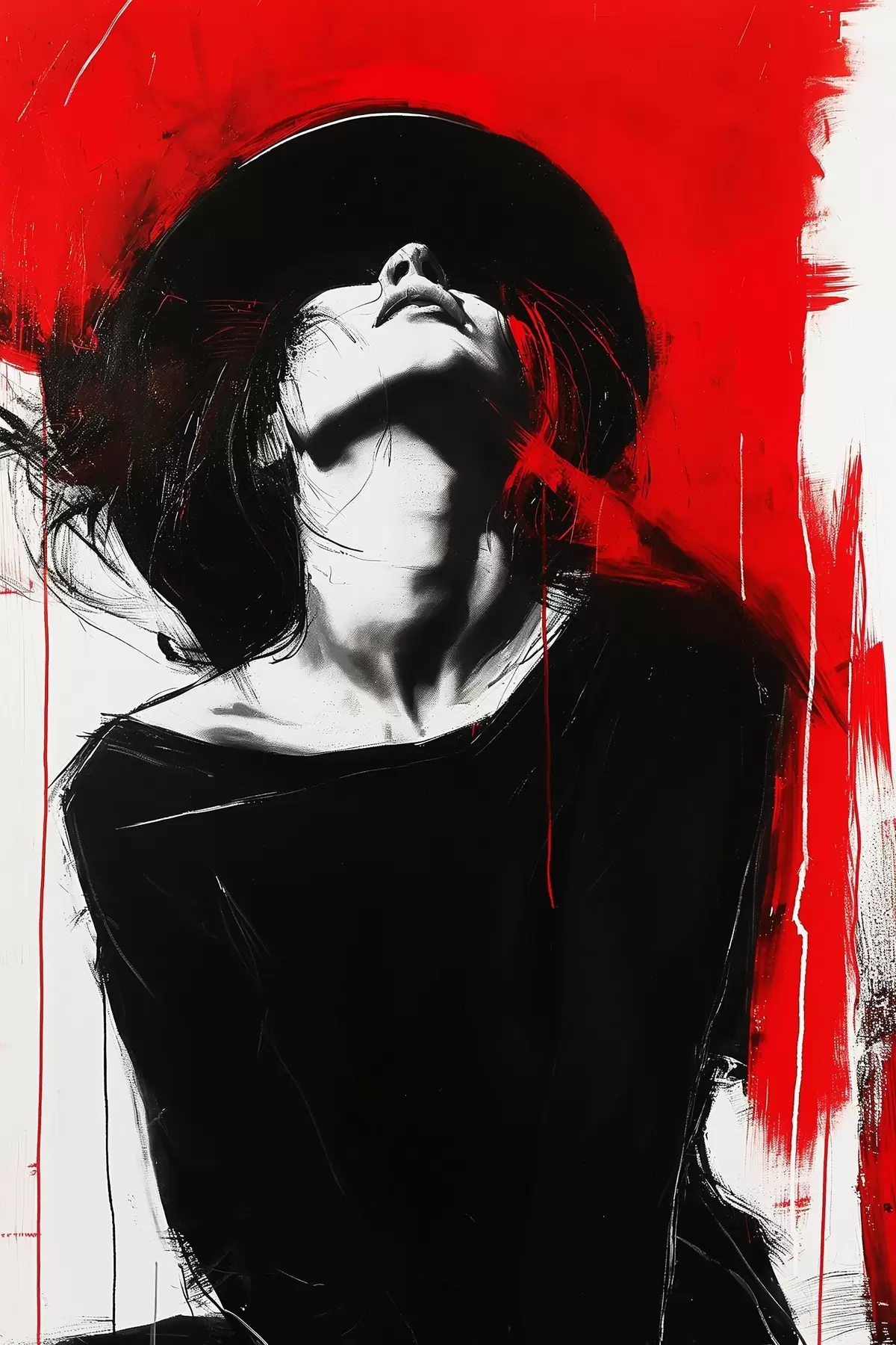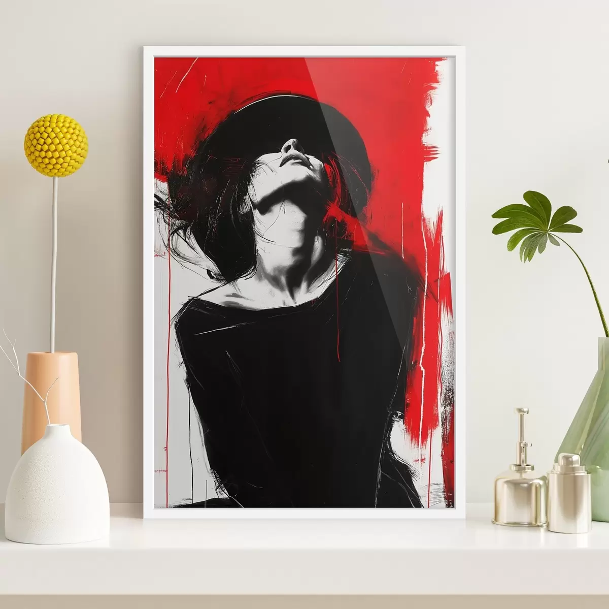 Poster Frau mit schwarzem Hut auf rotem Hintergrund f38561
