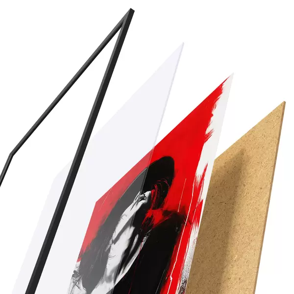 Das Poster besteht aus einem Rahmen, Plexiglas, einem gedruckten Bild und einer Rückwand aus Spanplatten. Dank der Halterungen auf der Rückseite kann das Poster sofort an die Wand gehängt werden.
