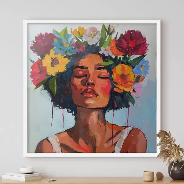 Poster Bild, das eine Frau mit Blumen im Haar zeigt f38575