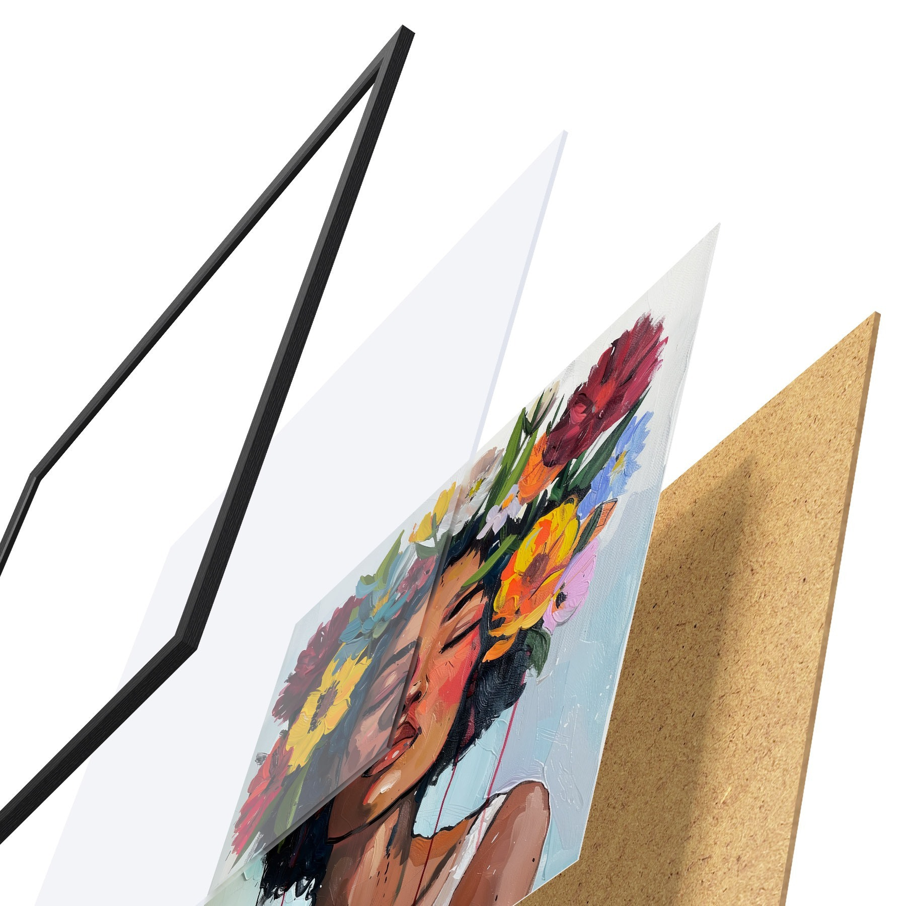 Das Poster besteht aus einem Rahmen, Plexiglas, einem gedruckten Bild und einer Rückwand aus Spanplatten. Dank der Halterungen auf der Rückseite kann das Poster sofort an die Wand gehängt werden.