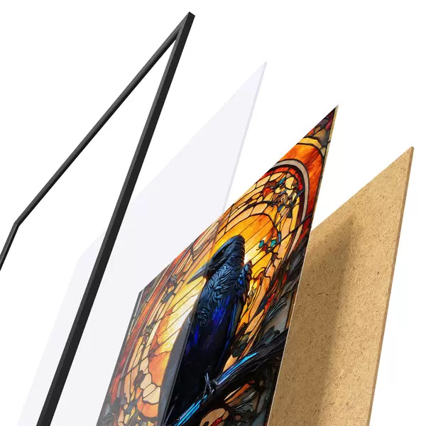 Das Poster besteht aus einem Rahmen, Plexiglas, einem gedruckten Bild und einer Rückwand aus Spanplatten. Dank der Halterungen auf der Rückseite kann das Poster sofort an die Wand gehängt werden.