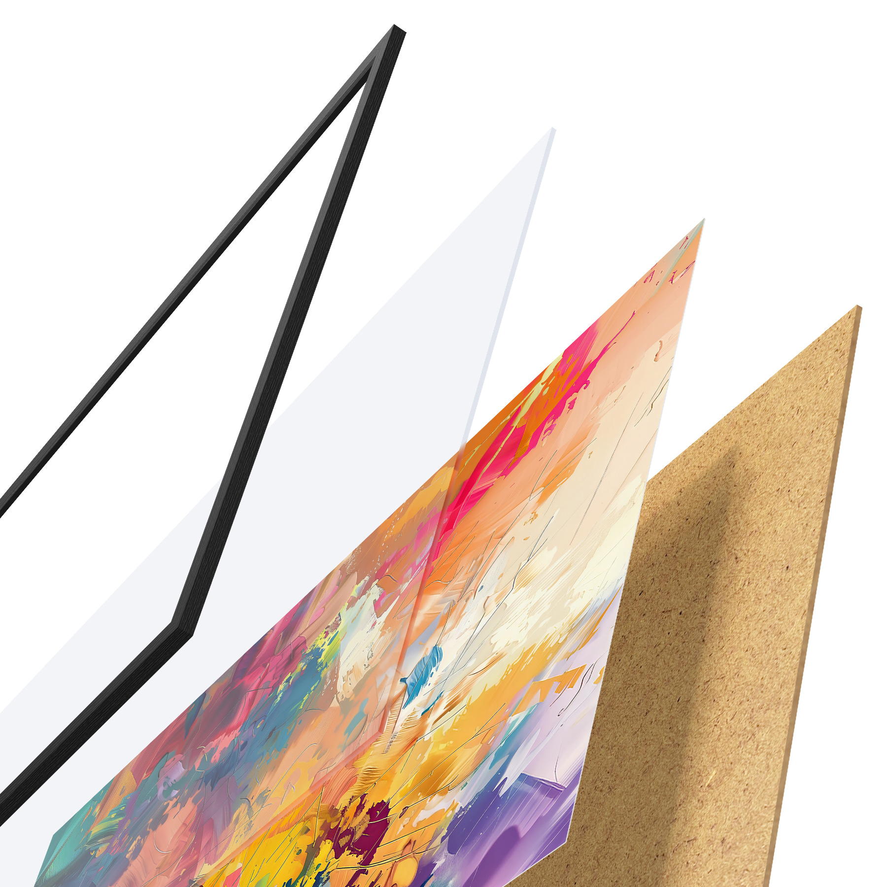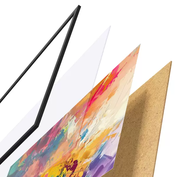 Das Poster besteht aus einem Rahmen, Plexiglas, einem gedruckten Bild und einer Rückwand aus Spanplatten. Dank der Halterungen auf der Rückseite kann das Poster sofort an die Wand gehängt werden.