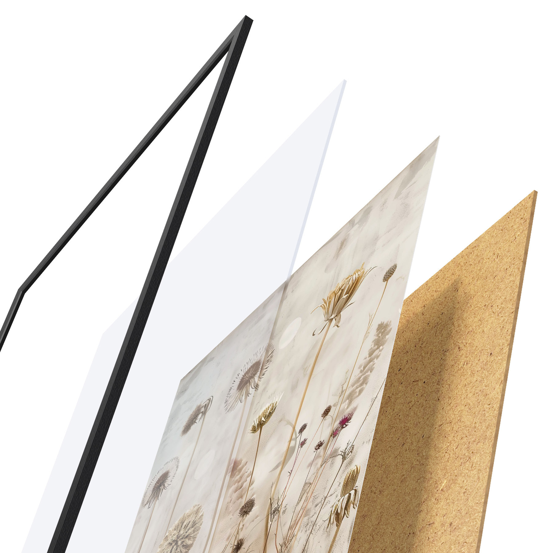 Das Poster besteht aus einem Rahmen, Plexiglas, einem gedruckten Bild und einer Rückwand aus Spanplatten. Dank der Halterungen auf der Rückseite kann das Poster sofort an die Wand gehängt werden.