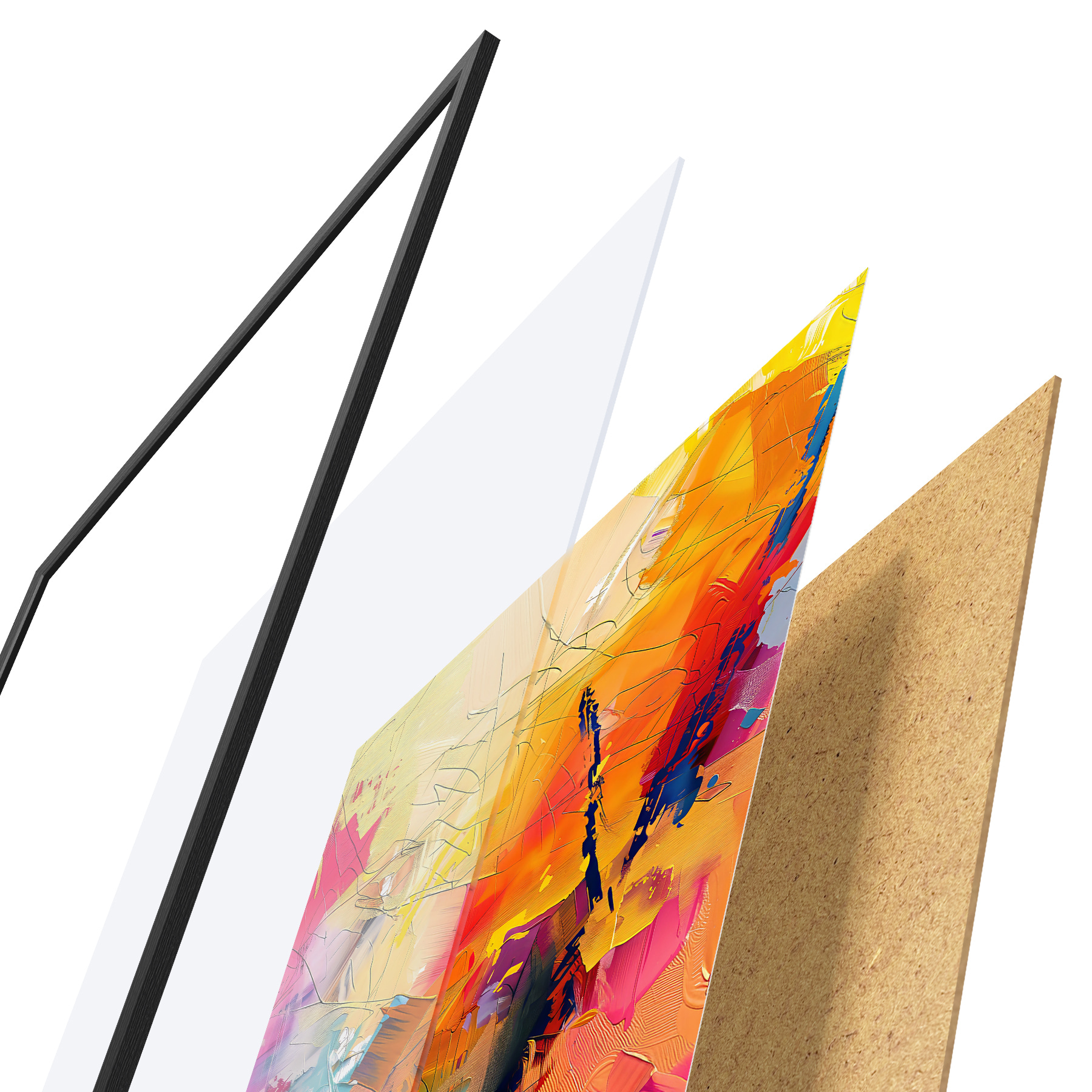 Das Poster besteht aus einem Rahmen, Plexiglas, einem gedruckten Bild und einer Rückwand aus Spanplatten. Dank der Halterungen auf der Rückseite kann das Poster sofort an die Wand gehängt werden.