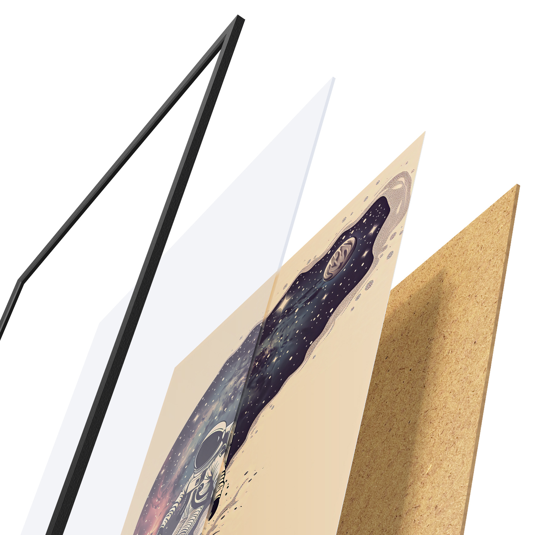 Das Poster besteht aus einem Rahmen, Plexiglas, einem gedruckten Bild und einer Rückwand aus Spanplatten. Dank der Halterungen auf der Rückseite kann das Poster sofort an die Wand gehängt werden.